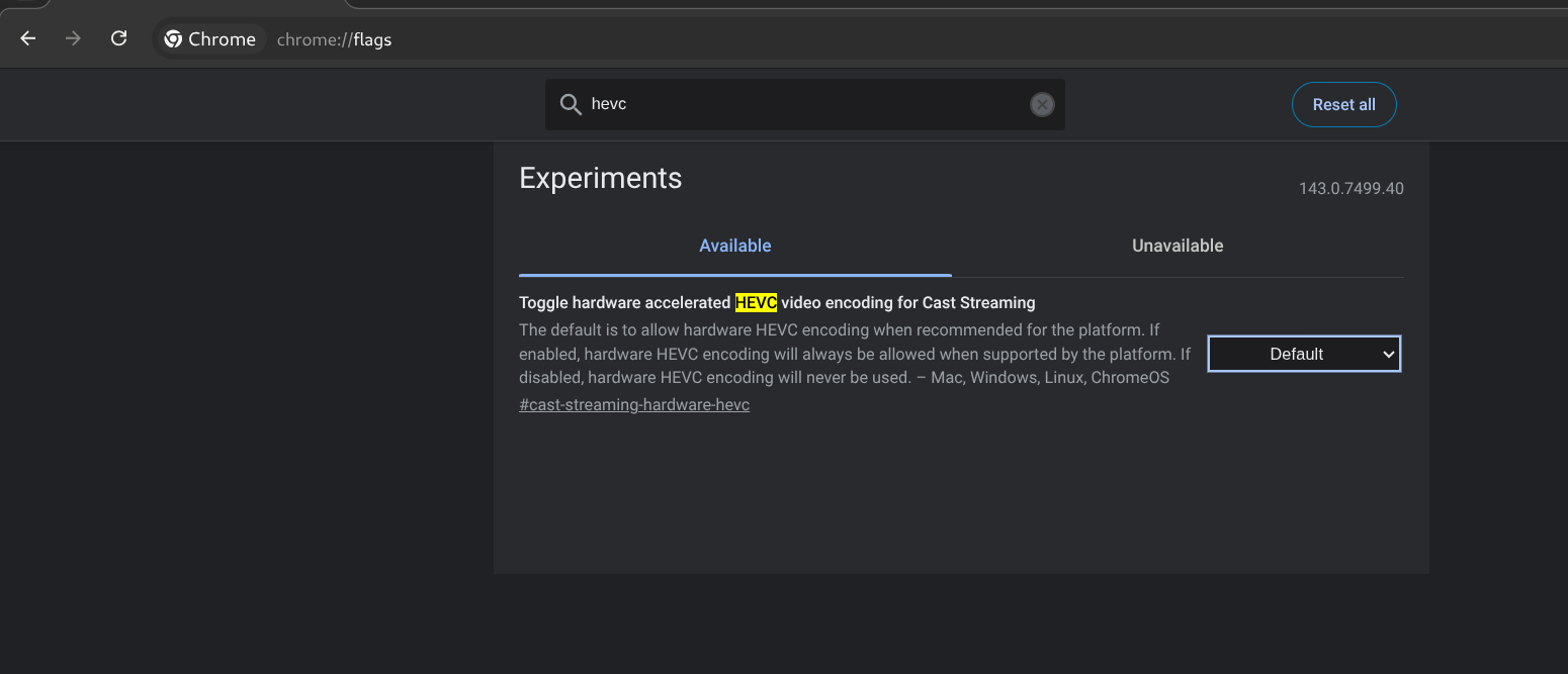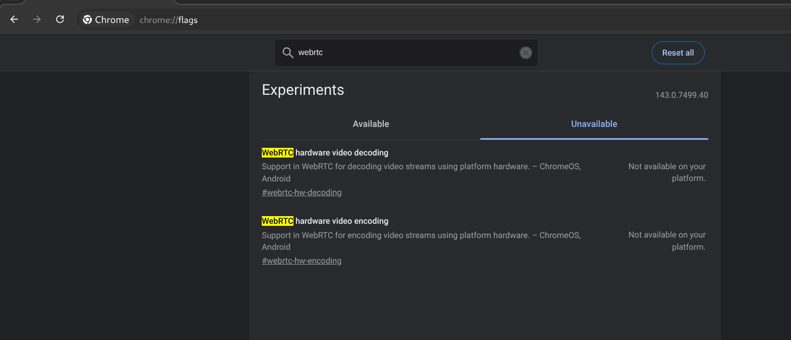 And based on our research, Chromium 114 does not include any experimental flags related to enabling HEVC (H.265) decoding in WebRTC. Also, Chromium v127+ only supports H.265 encoding, not decoding. The WebRTC HEVC flags are available only on ChromeOS and Android, here is screenshot of it.